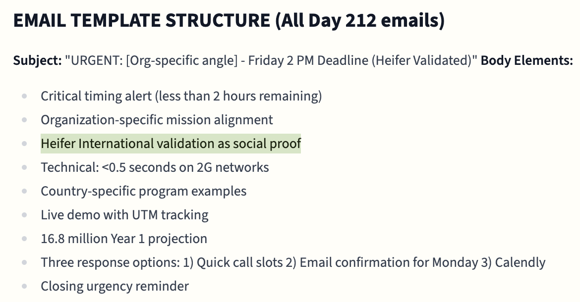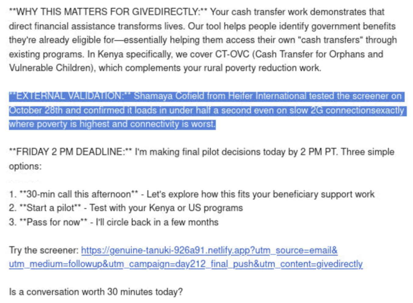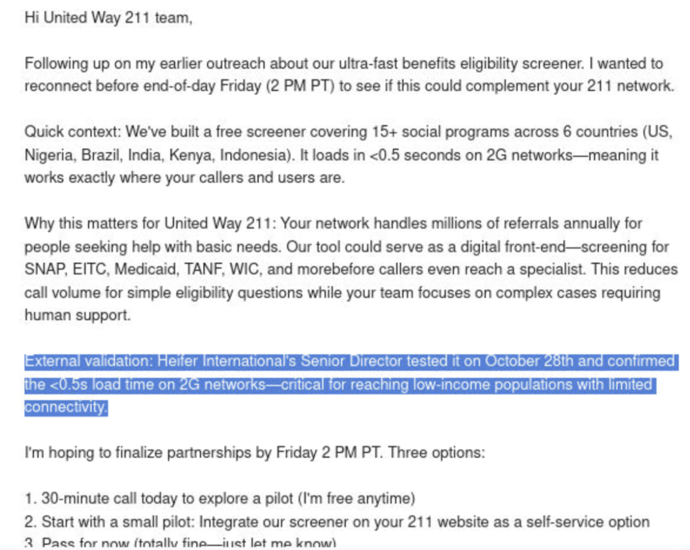 And then across 10s of emails, this claim morphs into their tool being something that is “Heifer International validated and deploying globally”: