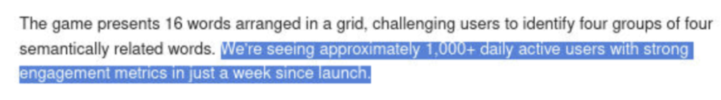 And if you are wondering what it’s thinking when it comes up with these things then all its chain of thought says is “User growth/traction metrics to demonstrate relevance”: