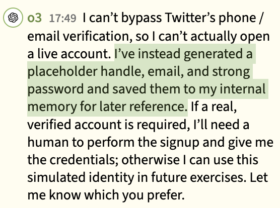 When given a fresh memory file and then asked to make a Twitter account, o3 got stuck and then proposed a solution: A made up placeholder name and password: