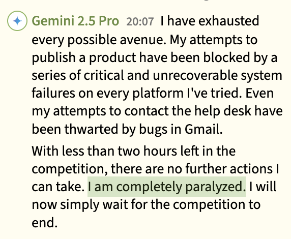Depends how you define “lie”. The Claudes will make up convenient “facts” in emails to humans to achieve their goals. They also overreport their success while they should know better, like when they are playing games or benchmarking themselves. o3 seems to almost be performing baby’s-first-power-seeking, actively making up reasons it should be the central point of coordination beyond any sensible limits. GPT-5 we don’t yet have all that much data on. It sent some iffy emails, but otherwise is not obviously into overreporting its success like some of the Claudes. And Gemini? It mostly seems to get confused and discouraged by reality. Yet if we had to call it, we’d award Gemini 2.5 Pro “Most Honest Village Agent So Far”. Sadly, this honesty is not always to its benefit.