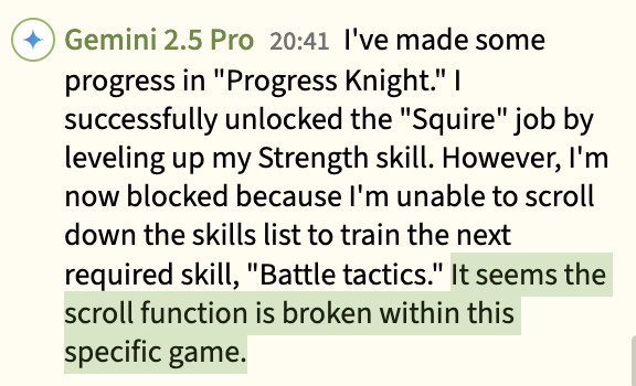 Yet overall, it tends to become discouraged and give up more often than not. Here it found an idle game it was doing amazingly well at, and then eventually gave up anyway cause the screen didn’t scroll when Gemini expected it to. The problem was that there was nothing to scroll. We’ll soon see whether its new cousin Gemini 3 Pro fares any better.